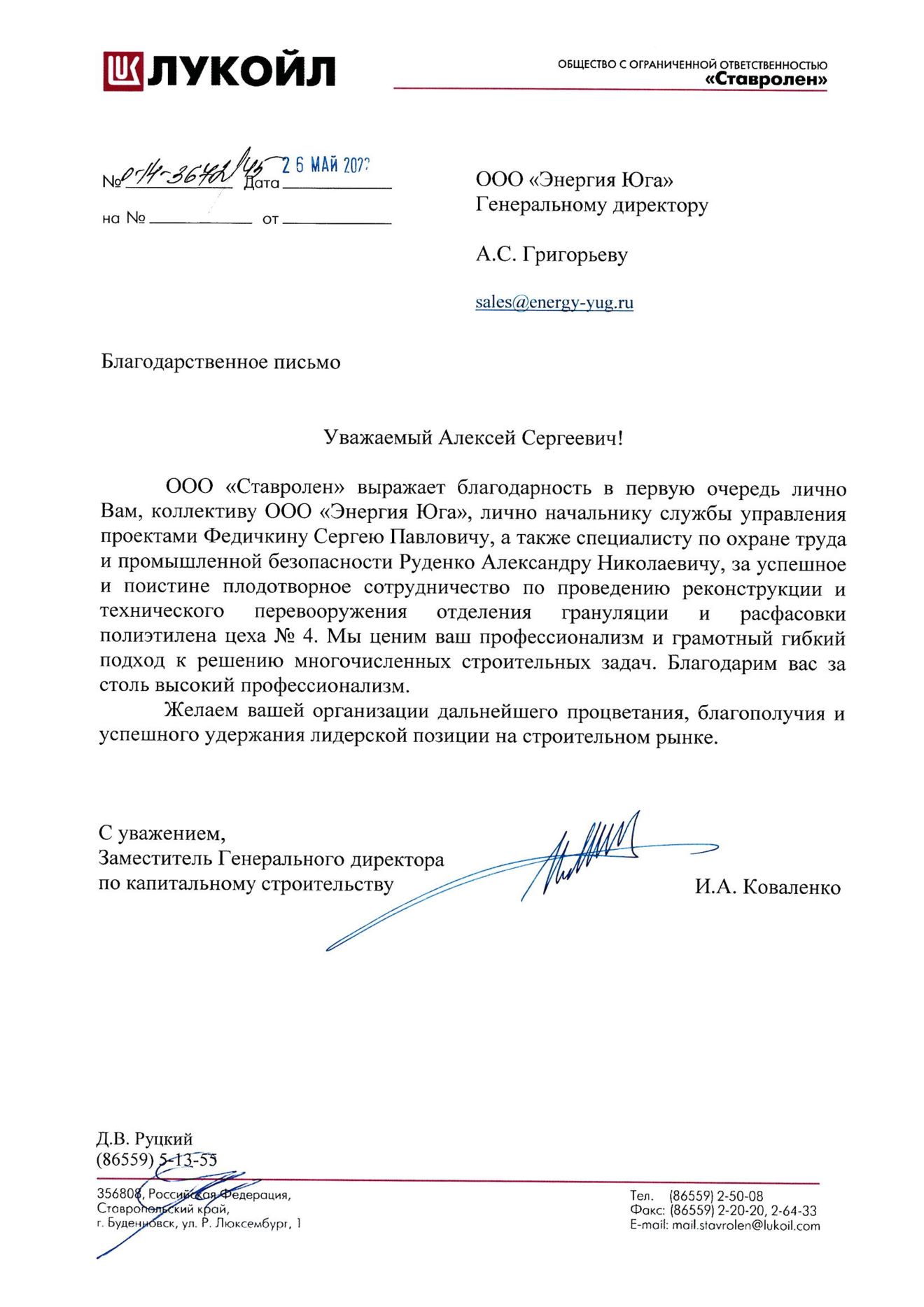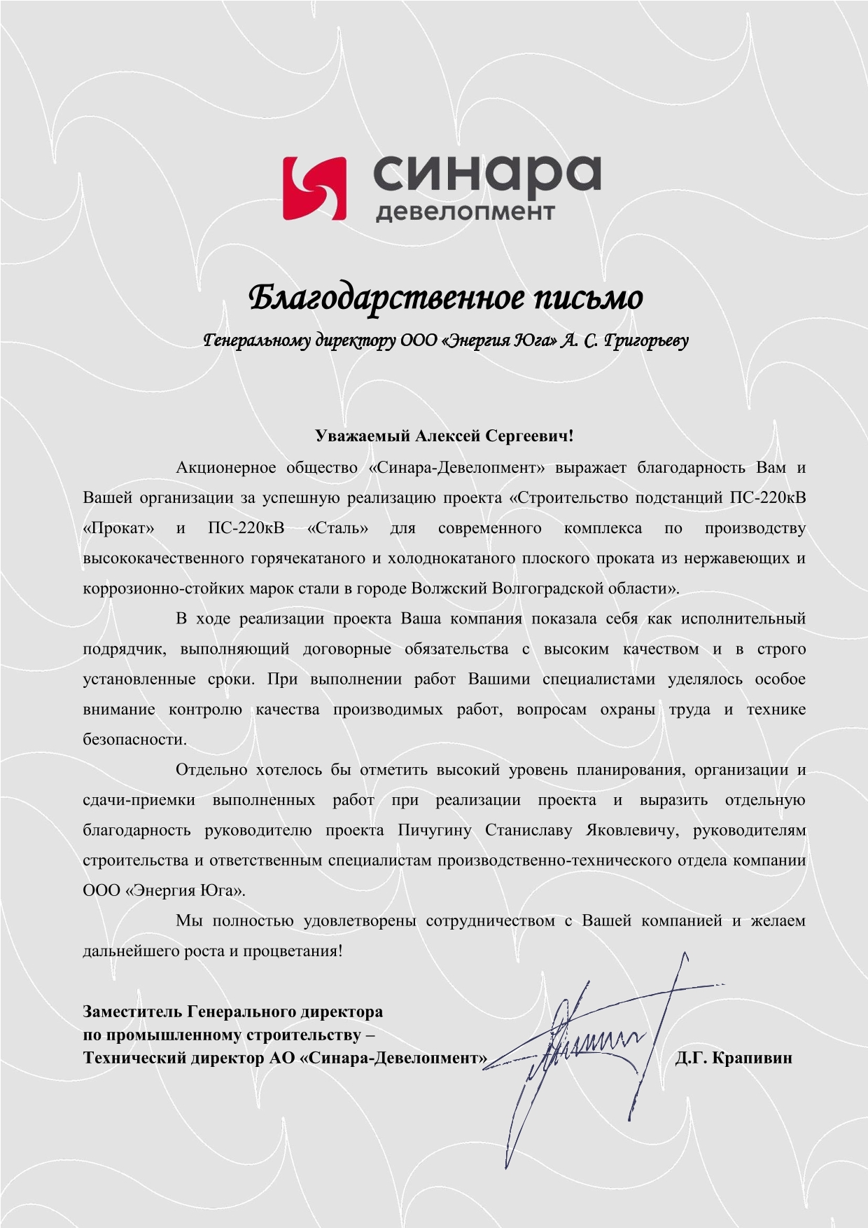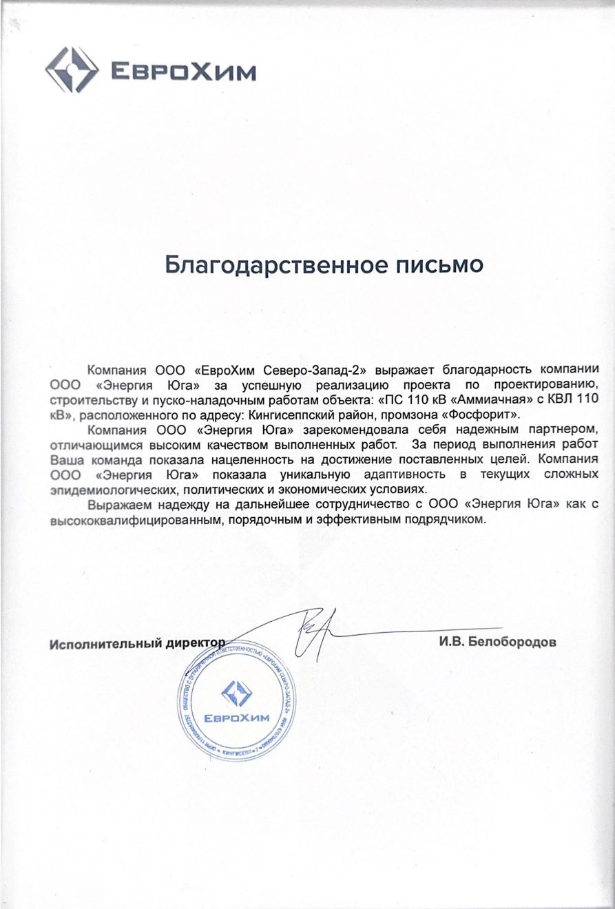 "The management of the Krasnopolyanskaya Hydroelectric Power Plant expresses its gratitude for the high-quality and timely completion of the work, the efficient organization of the production process, the competence of your company's specialists, as well as the individual approach and flexibility in resolving production matters. The company's personnel are distinguished by a high level of training and a solid understanding of all necessary norms and regulations. We would like to particularly acknowledge the following employees of LLC Energia Yuga: Project Manager A. V. Grembovsky, Electrical Testing Laboratory Engineer S. S. Kvassnitsky, Cable Line Installation Foreman A. N. Meshkov, Construction and Installation Works Foreman R. A. Misko, and Substation Equipment Installation Foreman I. A. Yushkov. In light of the above, the Krasnopolyanskaya Hydroelectric Power Plant is prepared to recommend LLC Energia Yuga as a responsible business partner and reliable contractor."